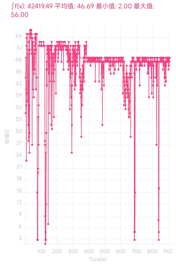 進入游戲后,初始幀率為55幀,但隨著游戲的逐漸發(fā)熱,幀率也逐漸進一步下降,后半段基本穩(wěn)定在48幀。
