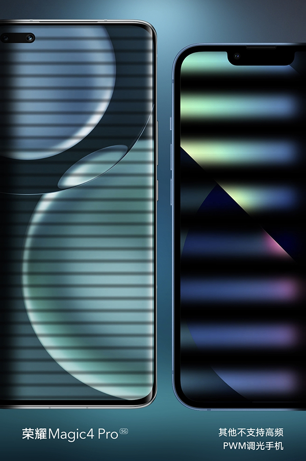 榮耀Magic4的1920Hz高頻PWM調(diào)光,可以通過更高的調(diào)光頻率來減小亮度波動,在光線不足的低亮度場景下,可以有效緩解用戶的視覺上的疲勞感,減輕眼部的壓力。下面咱們來一組對比,以同樣采用LTPO屏幕的iPhone 13 Pro Max和榮耀Magic4進行比較。