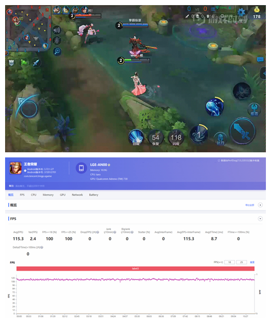 Magic4已經(jīng)適配《王者榮耀》的120幀模式,在30分鐘的游玩中,很少有發(fā)生卡頓,全程在110-120幀之間波動,最終平均幀114幀,游戲體驗很出色。