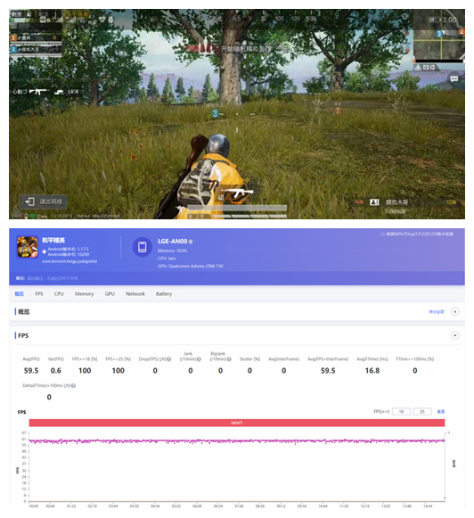 Magic4未適配《和平精英》尚未適配90幀模式,在高清加60幀模式下進行測試。在幀數(shù)圖中可以看出,幀率曲線都非常平滑,同樣沒有什么卡頓發(fā)生,30分鐘游戲后平均幀率為穩(wěn)穩(wěn)的60幀。
