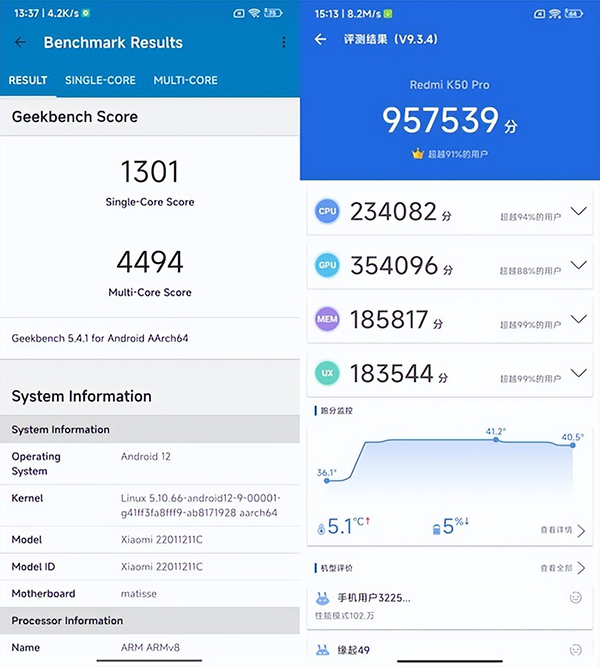 首先是傳統(tǒng)的跑分測(cè)試,小米12 Pro安兔兔分?jǐn)?shù)為956782分;Geekbench單核分?jǐn)?shù)為1196分,多核分?jǐn)?shù)為3602分。Redmi K50 Pro安兔兔分?jǐn)?shù)為957539分;Geekbench單核分?jǐn)?shù)為1301分,多核分?jǐn)?shù)為4494分。在跑分測(cè)試中,Redmi K50 Pro相比于小米12 Pro有著一定程度的優(yōu)勢(shì)。