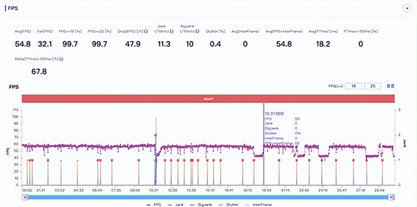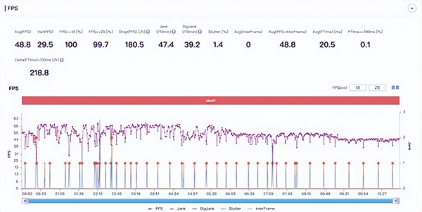 平均幀率上,小米12 Pro為48.8幀,Redmi K50 Pro為54.8幀。具體來(lái)看,Redmi K50 Pro在前18分鐘基本可以做到維持在60幀左右(10分鐘左右的卡頓由傳送造成),中間有輕微卡頓,但不明顯,基本不影響游戲。在18分鐘后游戲開(kāi)始出現(xiàn)幀率波動(dòng),幀率會(huì)短暫跌至40幀左右,經(jīng)過(guò)一分鐘再回到60幀,游戲中則能較為明顯的感受到幀率的下滑。而小米12 Pro在幀率上則不太穩(wěn)定,卡頓次數(shù)相對(duì)更多。