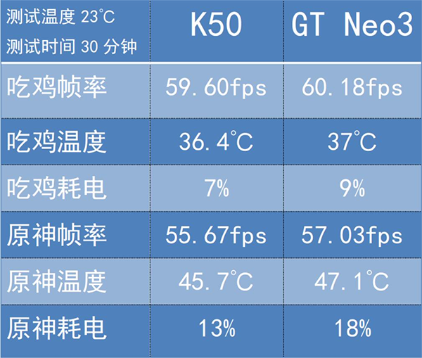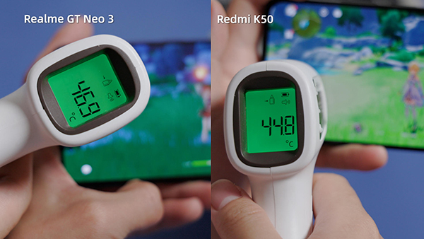 所以realme的平均幀率會更高達到了57.03幀,而Redmi K50則是55.67幀,當然與之相對應的就是realme的溫度也會高一些,K50的機身最高溫度是45度,而GT Neo3的溫度達到47度,這個就看大家的更喜歡哪種風格了。