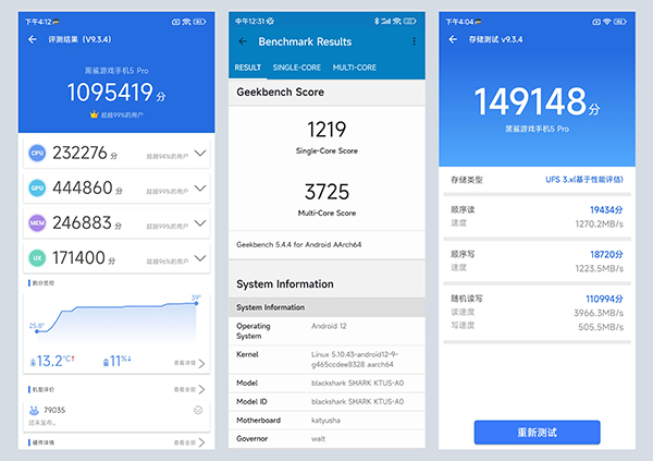 使用安兔兔進行跑分,黑鯊5 Pro的成績?yōu)?09萬+,是迄今為止我們見到過分數(shù)最高的手機。具體來看,它的成績優(yōu)勢主要體現(xiàn)在存儲方面,大概比常規(guī)手機高出5萬分以上。而在CPU和GPU跑分方面,黑鯊5 Pro的成績也比常規(guī)旗艦機更高一些,屬于主流之上的水準。之后我們又進一步對它的磁盤陣列存儲進行了測試,安兔兔存儲跑分近15萬,比常規(guī)的手機高出5~10萬分,屬實是斷層式領先。