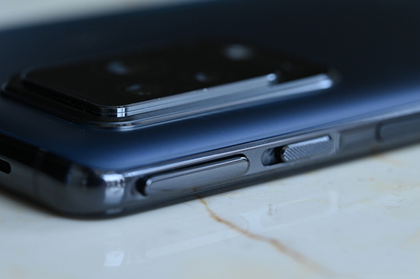 機(jī)身右側(cè),上下各有一枚可以控制開關(guān)的磁動力肩鍵,通過開關(guān)控制肩鍵的升起/降落。彈出式的雙磁動力實(shí)體肩鍵可以帶來無限接近專業(yè)游戲手柄的LR鍵的手感,較之其他電競手機(jī)的壓感肩鍵有著云泥之別,清脆的按鍵咔咔聲會讓我們玩起游戲時更加帶感。