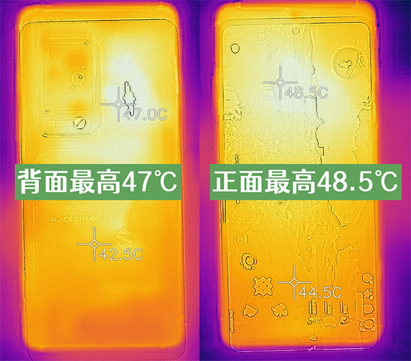 當(dāng)然了,這么好的表現(xiàn)肯定是需要更激進(jìn)的性能調(diào)度,這也是游戲手機(jī)的取舍,30分鐘平均功耗8W,此時(shí)背面最高溫度47℃,正面最高溫度48.5℃。