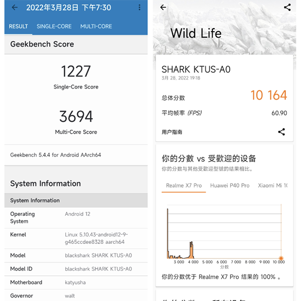 根據(jù)我們測試的數(shù)據(jù)來看,黑鯊5 Pro在GeekBench5的單核分數(shù)為單核1227,多核分數(shù)為3694分,整體表現(xiàn)比較出色。而在3DMark Wild Life的跑分成績中,讓我們比較驚訝,分數(shù)足足達到了10164分,這是目前我們在所有無風扇手機中所看到的最高的分數(shù),也是第一個無風扇破萬的手機。其他的驍龍8 Gen 1手機基本分數(shù)都是在9000左右浮動,很難跑到破萬的水平。