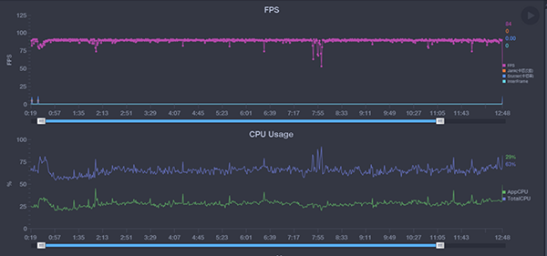 經(jīng)小編實測,在運(yùn)行《和平精英》50分鐘后,機(jī)身最高溫度為33度左右,而且熱量分布很均勻,沒有出現(xiàn)局部區(qū)域過熱的情況。在將畫面設(shè)置為流暢+90幀幀率的情況下,從進(jìn)入游戲開始檢測,該機(jī)在大約20分鐘的游戲中平均幀率為84fps,幀率曲線非常平滑,表現(xiàn)穩(wěn)定,整個游戲過程中的開關(guān)門、射擊、開車、切換視角等場景都非常流暢。而cpu的能耗平均為29%。