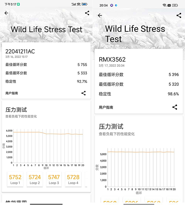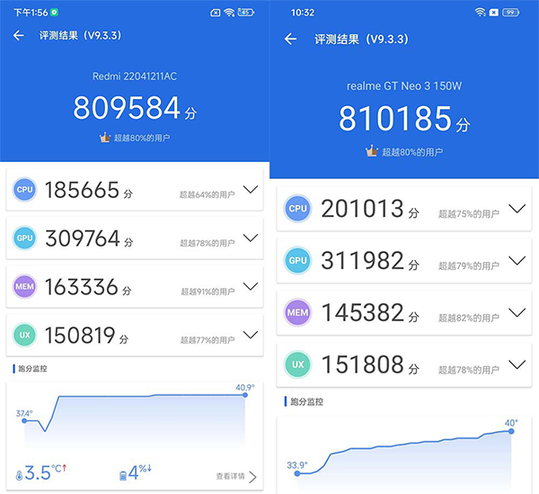 性能表現(xiàn)上,理論上兩者差不多,在高負載環(huán)境中兩款手機各有取舍,在《王者榮耀》這種中負載游戲里也比較穩(wěn)定,只不過紅米K50會降亮度,而真我GT Neo3目前還沒發(fā)現(xiàn)降亮度的情況,看你更喜歡哪一掛的了。