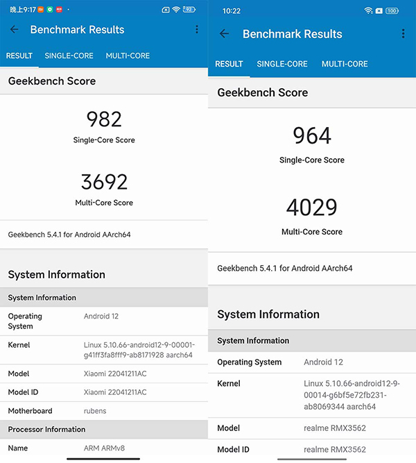 CPU和GPU性能是比較令人驚喜的地方。CPU因為是4+4的大核+小核架構(gòu),所以從成績上來說,兩款手機的單核成績并不算出色,也就是驍龍865的水平。但如果是多核,天璣8100又能達到驍龍8的水平,尤其是真我GT Neo3,多核成績更是突破了4000分。
