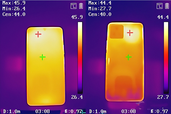 機身溫度表現(xiàn)還不錯,正面最高45.9℃,背面最高44.4℃,拿在手上也只是有一點溫?zé)幔⒉凰銧C手,只能說塑料中框也救了一命。