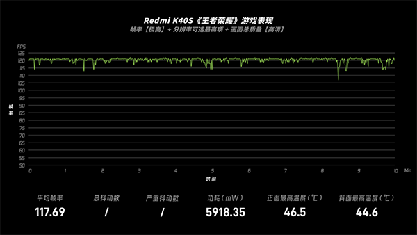 先看120fps的《王者榮耀》,測(cè)得其平均幀率117.69fps,幀率全程都維持在100fps以上,不過(guò)發(fā)熱也跟著上來(lái),背部最高溫度44.6℃。