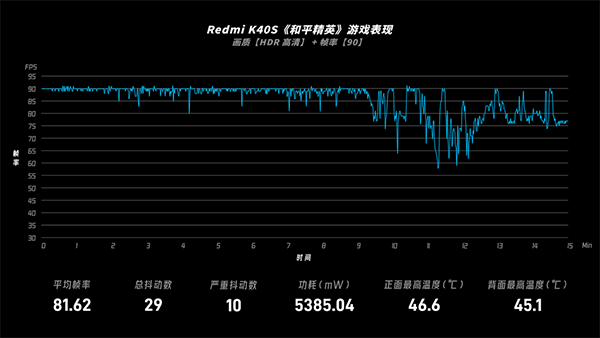 再看《和平精英》,幀率變化線可見(jiàn)前程的表現(xiàn)還是很穩(wěn)的,只是到后面幀率的變化幅度也跟著上來(lái)了——整體平均幀率81.62fps,錄得29次幀率抖動(dòng),其中有10次較為嚴(yán)重的抖動(dòng)出現(xiàn),而背部的溫度也達(dá)到45.1℃。