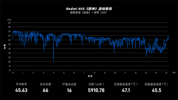 最后看著名跑分游戲《原神》的表現(xiàn),游戲畫(huà)面設(shè)置為60fps模式,而它的平均幀率45.63fps,共錄得16次較嚴(yán)重的幀率抖動(dòng),背部溫度45.5℃。