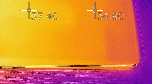 在主板關(guān)鍵散熱單元的前后兩面均精心設(shè)計(jì)了兩塊 VC 散熱組件,雙 VC 總面積達(dá)到了驚人的 5320mm2。在實(shí)際玩游戲時(shí),機(jī)身持續(xù)保持著最37℃左右(和平精英60幀模式),表現(xiàn)很好了。