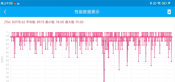 《和平精英》支持最大的幀率模式為90幀,所以黑鯊5 Pro最高也只能拉到90幀的性能。經(jīng)過實(shí)測(cè),該機(jī)運(yùn)行幀率最大值能夠達(dá)到91幀,而平均幀率大概在89幀左右,運(yùn)行相對(duì)平穩(wěn)一些。