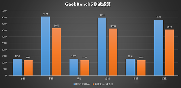 接著我們再來看看考驗CPU性能的GeekBench5測試。從上圖可以看出,Redmi K50 Pro在三輪測試中全面領先驍龍8 Gen1手機,無論是單核成績還是多核成績,均展現出強悍的表現??紤]到天璣9000的超大核和大核頻率均高于驍龍8 Gen1,所以這一測試結果基本符合預期。