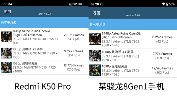 在考驗GPU性能表現的GEXBench測試中,上圖結果顯示,Redmi K50 Pro和驍龍8 Gen1手機基本處于同一水準,在3個典型場景中的性能差距微乎其微,驍龍8 Gen1在GPU上的性能優(yōu)勢并沒有發(fā)揮出來。