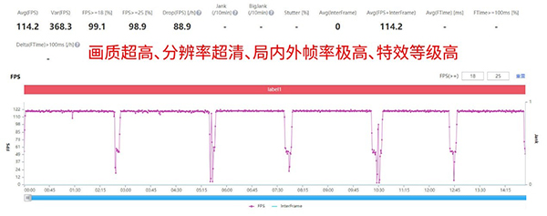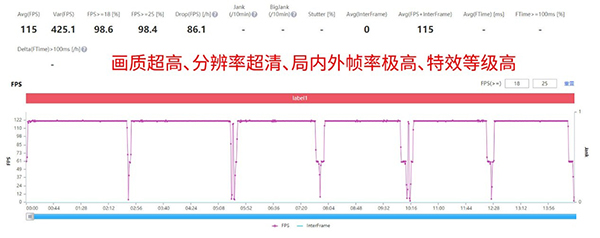 在熱門(mén)競(jìng)速手游《QQ飛車(chē)手游》中,開(kāi)啟超高畫(huà)質(zhì)、超清分辨率,局內(nèi)外幀率極高、特效等級(jí)高,測(cè)試中進(jìn)行6局連續(xù)個(gè)人任務(wù)。測(cè)試結(jié)果為驍龍8 Gen1手機(jī)平均幀率115幀,Redmi K50 Pro平均幀率114.2幀,兩部手機(jī)均沒(méi)有出現(xiàn)大范圍抖動(dòng)掉幀,幀率表現(xiàn)完全處于同一水準(zhǔn)。