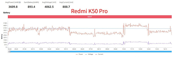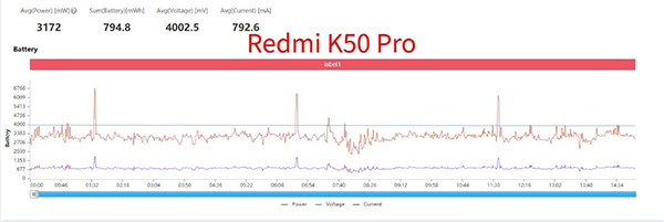 功耗表現(xiàn)上,Redmi K50 Pro的功耗為3172mW,某驍龍8 Gen1手機(jī)功耗為3469.6mW,在兩部手機(jī)幾乎相同的幀率表現(xiàn)上,又是Redmi K50 Pro比較省電,10%的功耗差距會(huì)明顯反映在續(xù)航表現(xiàn)上。
