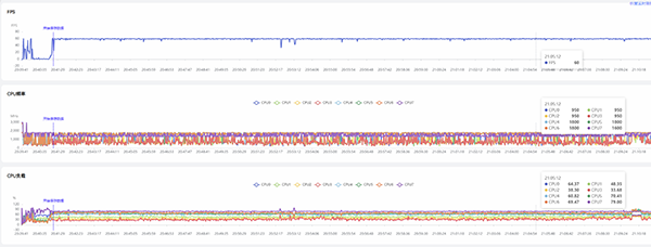 接著我們來看下曲線圖。需要注意兩個方面,其一是雖然幀率有出現(xiàn)波動,但是整體的幀率曲線還是比較平穩(wěn)的,并沒有過熱降頻;其二則是多個核心會始終參與工作,并且壓力非常平均的分配到多個核心上,沒有出現(xiàn)一核著火多核圍觀的情況。