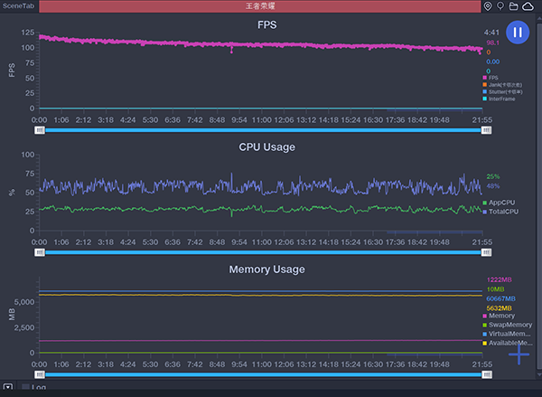 在王者榮耀的測(cè)試中,幀率的表現(xiàn)與和平精英基本雷同。一加10 Pro支持王者榮耀的120幀,在20多分鐘的游戲中,一加10 Pro的幀率曲線依然呈平穩(wěn)下降趨勢(shì),最后幀率穩(wěn)定在100FPS左右,整個(gè)游戲過(guò)程中沒(méi)有任何明顯的卡頓現(xiàn)象,絲滑且順暢,游戲表現(xiàn)非常不錯(cuò)。之所以一加10 Pro的幀率曲線呈平穩(wěn)下降狀態(tài),基本一條線,主要還是這款手機(jī)的調(diào)度問(wèn)題,手機(jī)采用平穩(wěn)降幀的模式在溫度中做出了均衡,既保證了手機(jī)的流暢度,又將手機(jī)的溫度控制在一個(gè)合理狀態(tài)。