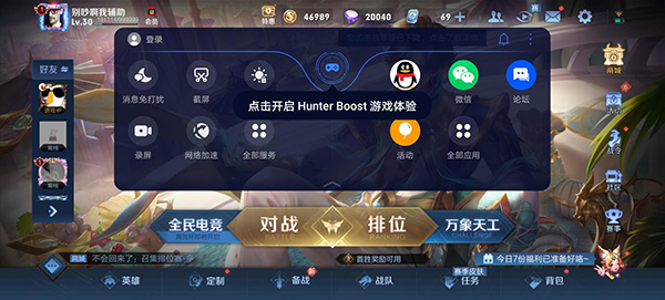 榮耀Play6T Pro還為游戲玩家定制了主打游戲體驗(yàn)的“Hunter Boost”模式,開啟后火力全開,徹底釋放硬件性能,提升游戲的流暢性與穩(wěn)定性。在游戲中,在屏幕上方下滑可呼出輔助菜單,可以選擇性打開消息免打擾、亮度鎖定、網(wǎng)絡(luò)加速、小窗口查看QQ/微信消息等,打游戲也不耽誤與女朋友聊天。
