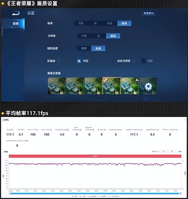 具體到游戲體驗(yàn)中,筆者選取了《王者榮耀》、《和平精英》兩款熱門手游。首先在《王者榮耀》中,在最高幀率模式下,vivo X Note整體表現(xiàn)較為穩(wěn)定,無論是打野還是團(tuán)戰(zhàn)都沒有出現(xiàn)明顯的卡頓情況,游戲全程平均幀率達(dá)到了117.1幀。