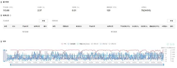 通過(guò)實(shí)際測(cè)試數(shù)據(jù)來(lái)看,vivo X Note運(yùn)行《王者榮耀》120幀模式的平均幀率為113.68fps, 抖動(dòng)率2.37%、歸一化電流296.52。使用人物為阿骨朵打野,機(jī)身正面平均溫度為39.8℃、機(jī)身背面平均溫度為38℃,機(jī)身沒(méi)有明顯發(fā)熱,握持時(shí)沒(méi)有感受到在高負(fù)載游戲下機(jī)身的溫度變化,約11 分鐘的游戲時(shí)長(zhǎng)內(nèi)幀率出現(xiàn)小幅波動(dòng),高負(fù)載壓力下,畫面內(nèi)多個(gè)人物釋放技能未出現(xiàn)掉幀現(xiàn)象。