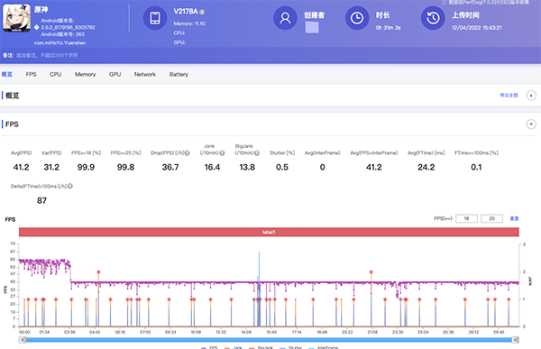 30分鐘游戲,平均幀率41.2fps,前3分鐘幀率保持在60fps,隨后基本全程穩(wěn)幀40,后期包括戰(zhàn)斗場景,幀率基本都維持在40fps上下,波動變化很小。