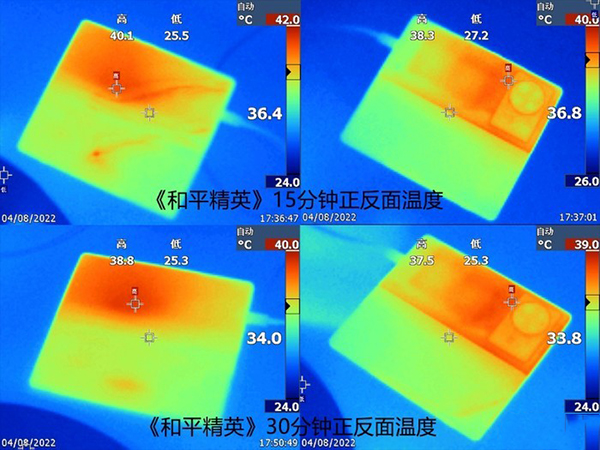 在《王者榮耀》以及《和平精英》的測試中,最高溫度落在15分鐘正面上半?yún)^(qū)的42°。