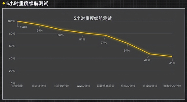 在這個(gè)電池續(xù)航方面,vivo X Fold搭載了4600mAh電池,處于當(dāng)前旗艦機(jī)型的主流水平。我們使用折疊屏手機(jī)5小時(shí)重度續(xù)航模型對(duì)手機(jī)進(jìn)行了測(cè)試,測(cè)試時(shí),手機(jī)系統(tǒng)音量和屏幕亮度均設(shè)為50%,Wi-Fi和藍(lán)牙開啟,開啟智能刷新率。測(cè)試內(nèi)容包括30分鐘30fps 1080P視頻錄制、45分鐘B站1080P視頻播放、50分鐘抖音視頻播放、60分鐘高幀模式《王者榮耀》、45分鐘微博刷信息流、30分鐘淘寶首頁(yè)瀏覽以及50分鐘QQ語音聊天。