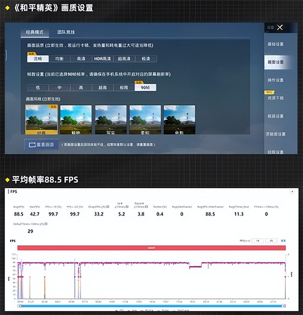 相較于《王者榮耀》,《和平精英》的游戲表現(xiàn)更為穩(wěn)定,游戲全程的平均幀率達(dá)到了88.5幀,游戲過程中也并沒有出現(xiàn)卡頓的情況。幀率曲線中一處降頻至80幀的情況在游戲中并無明顯感受,而根據(jù)數(shù)據(jù)復(fù)盤的情況,在18′26″的時候,CPU溫度上升至了45℃,導(dǎo)致了降頻。但好在后續(xù)溫度下降后,恢復(fù)至了90幀的游戲幀率。這可能還是出于測試版固件偏保守的性能調(diào)度模式,不過好在并不影響游戲體驗。