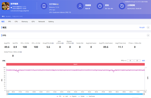 《和平精英》在流暢畫(huà)質(zhì)下支持原生90幀模式,PerfDog軟件記錄到的平均幀數(shù)為89.6幀,游戲全程波動(dòng)都不大,包括開(kāi)車(chē)、對(duì)戰(zhàn)等場(chǎng)景都能保持穩(wěn)定的幀數(shù),可以體驗(yàn)到絲滑流暢的高幀畫(huà)面。