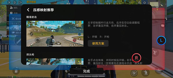 比如在《和平精英》游戲中,可以把左邊壓感映射為開(kāi)鏡,右邊壓感映射為開(kāi)槍。系統(tǒng)提供了推薦的壓感組合方案,可以直接選擇使用預(yù)設(shè)的方案,更加方便。