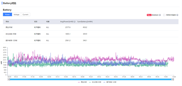 從上面對(duì)比表格可以看到,開(kāi)啟優(yōu)化功耗后,整機(jī)功耗明顯下降。即使是提升幀率模式,功耗也比原生90幀模式更低,獨(dú)立顯示芯片Pro帶來(lái)的提升十分明顯。
