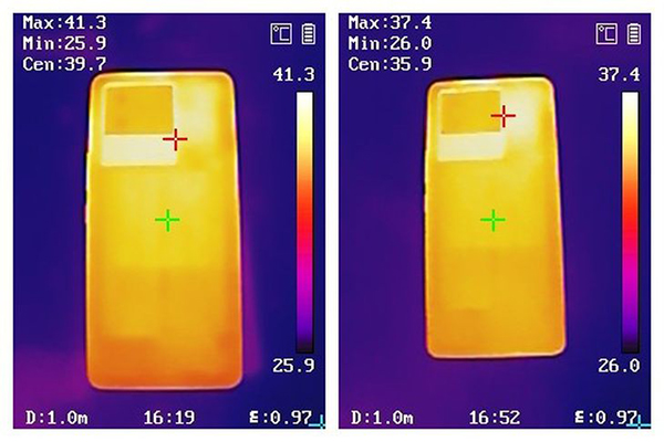 在室溫約25度環(huán)境,《和平精英》原生90幀10分鐘游戲后,背面最高溫為41.3度。而開(kāi)啟優(yōu)化功耗后,10分鐘游戲后背面最高溫度為37.4度,機(jī)身溫度同樣有明顯下降。