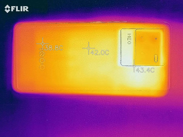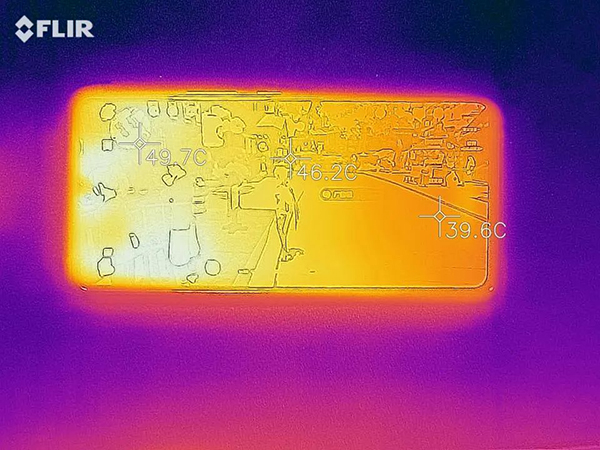 在溫度上,手機運行30分鐘《原神》后,最高溫度出現(xiàn)在機身正面左上角,為49.7℃,從這個較高的溫度也可以看出iQOO激進的性能釋放,背面溫度最高為43.4℃,在驍龍8手機屬于較低的水平。雖然iQOO Neo6正面溫度稍高,但好在正面和背面兩個主要熱源都避開了雙手握持區(qū)域,對游戲體驗的影響不大。