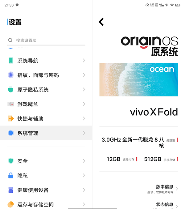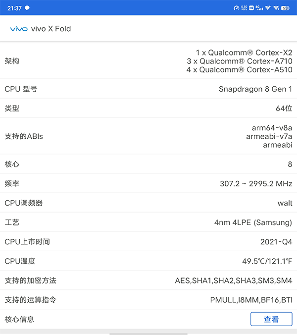 vivo X Fold在這個硬件配置方面并不含糊,畢竟都賣到了8999起售,雖然在折疊屏當中很有性價比。作為今年的旗艦機,并沒有像某廠一樣因為所謂的打磨,所以只給了去年的配件。驍龍8 Gen1三件套,12GB的LPDDR5內存以及256G的UFS3.1閃存起步。