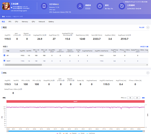 根據(jù)測試,使用vivo X80 Pro開啟《王者榮耀》120幀模式后,其平均幀率為119.5幀,全程沒有出現(xiàn)過明顯的掉幀情況。