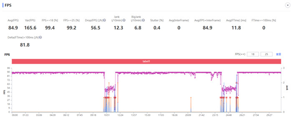 《英雄聯(lián)盟》30分鐘平均幀率為84.9幀,從幀率圖可以看到,除了兩次切換對局的幀率波動之外,游戲內(nèi)的畫面幀率非常穩(wěn)定,基本呈一條直線。
