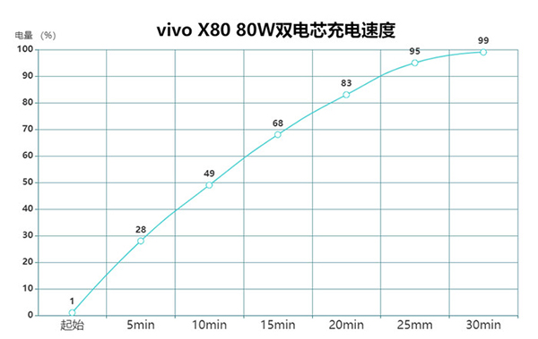 看看vivo X80的充電速度,實測從1%的起始電量,5分鐘充至28%,10分鐘充至49%,15分鐘充至68%,33分鐘后完全充滿。