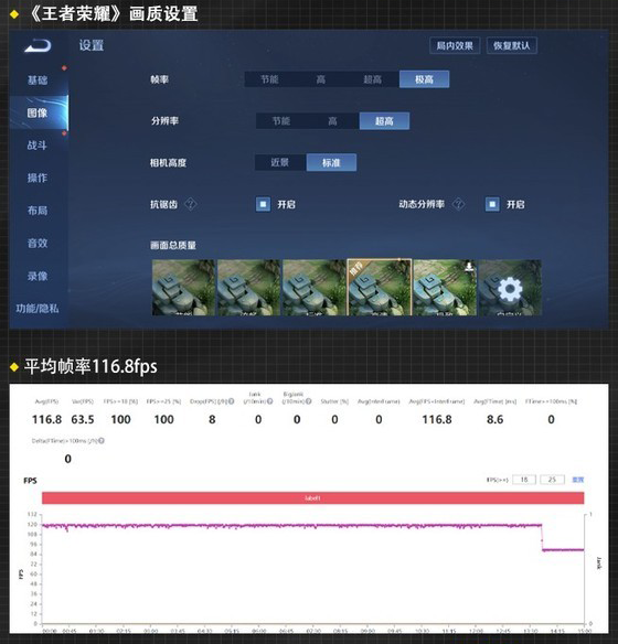 首先是《王者榮耀》游戲,我對其進行了15分鐘的游戲測試,值得一提的是vivo X80支持《王者榮耀》120幀超高幀運行,能為大家?guī)砀恿鲿车挠螒蝮w驗,針對這一點我們是要提出表揚的。在幀率表現(xiàn)方面,vivo X80的平均幀率為116.8幀,其中在120幀的情況下運行的十分流暢沒有出現(xiàn)一絲卡頓現(xiàn)象,雖然在14分鐘左右?guī)式抵?0幀,但這也屬于正?,F(xiàn)象,綜合游戲體驗是非常流暢的。