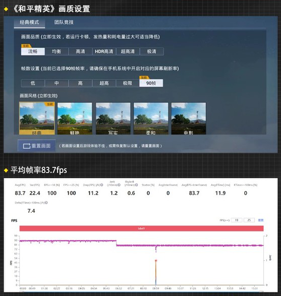 其次,我們還對其進行了《和平精英》游戲測試,vivo X80支持原生90幀高幀運行,所以游戲畫面的流暢度表現(xiàn)是非常優(yōu)異的。在測試過程中,vivo X80的平均幀率為83.7幀,雖然在游戲過程中出現(xiàn)了掉幀的現(xiàn)象,但是整體幀率曲線是非常穩(wěn)定的,游戲體驗方面也是較為優(yōu)秀的。