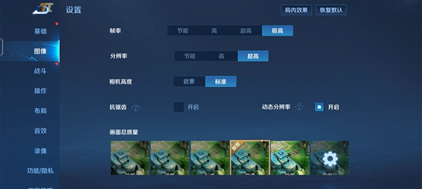 在《王者榮耀》中,我們將幀率改為極高、分辨率改為超高,畫面總質(zhì)量默認(rèn)為高清。