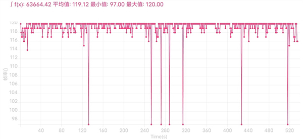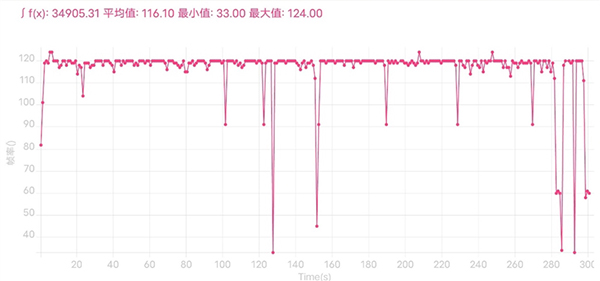 在快速單局中,除去結(jié)算動畫和死亡導(dǎo)致的幀率波動,《王者榮耀》整體都能保持在120幀左右,平均幀率也有116幀,