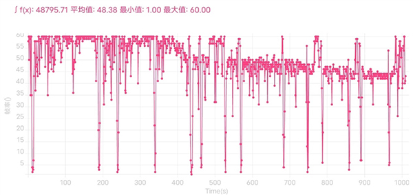 在《原神》隨機跑圖、打怪15分鐘,除去加載地圖、傳送地圖導(dǎo)致的波動,《原神》在前5分鐘能夠穩(wěn)定60幀左右,隨著手機開始發(fā)熱,開始逐漸降至45幀左右,平均幀率為48幀。