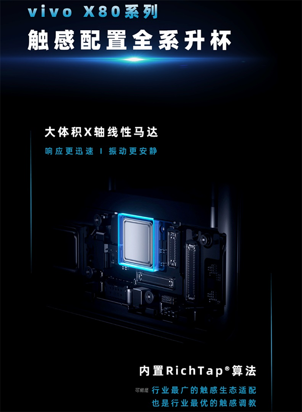 為了打造體驗(yàn)的超大杯,vivo X80系列搭載瑞聲科技的大體積X軸線性馬達(dá),相比上一代,X80系列的X軸馬達(dá)結(jié)構(gòu)升級(jí),驅(qū)動(dòng)力提升,體積增加93%,振動(dòng)量提升70%,振動(dòng)噪音降低30%。振感更加強(qiáng)勁而且安靜。這也是vivo首次內(nèi)置瑞聲科技自研RichTap?算法,響應(yīng)時(shí)間在RichTap?調(diào)教之下縮短至行業(yè)領(lǐng)先的5ms,振動(dòng)響應(yīng)更迅速。
