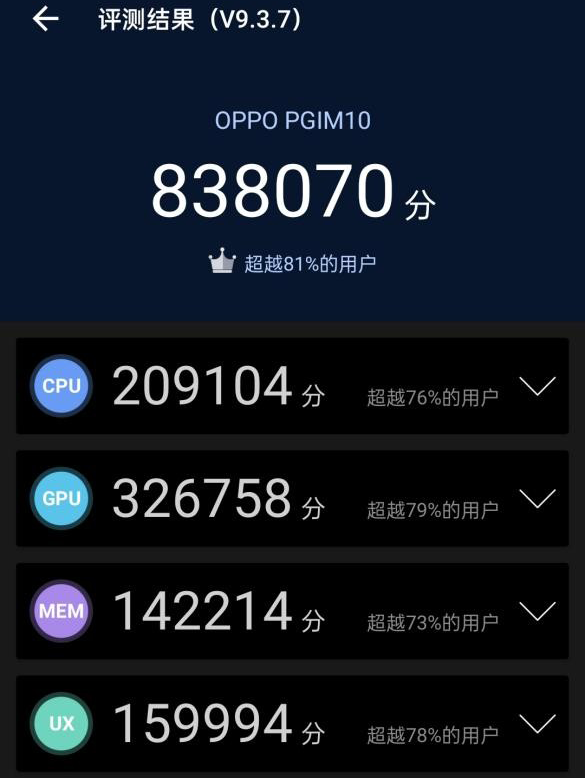 在這個(gè)性能配置上,OPPO K10 Pro搭載驍龍888處理器,作為去年的旗艦移動(dòng)芯片,性能方面基本沒什么好擔(dān)心的,能夠滿足絕大多數(shù)的使用場景,各種大小游戲也能輕松應(yīng)對??梢哉f,OPPO K10 Pro搭載了經(jīng)典的“853”性能組合,即高通驍龍888、LPDDR5以及UFS 3.1,天生便擁有不俗的性能基礎(chǔ)。簡單地用這臺(tái)OPPO K10 Pro進(jìn)行安兔兔跑分測試,三輪測試下來,得到最高838070分,平均835084分的優(yōu)秀成績。盡管時(shí)隔一年各大廠商對于驍龍888的調(diào)教已近趨成熟,但OPPO K10 Pro的這一跑分成績亦能輕松排至前列。