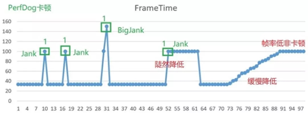 要做到幀率平穩(wěn),就要跨過斷崖式掉幀和突然卡頓兩座大山。在專業(yè)手機性能測試軟件Perfdog的官方文檔示意圖中(下圖),就很好的說明了這個問題。突然卡頓用Jank值來表示,斷崖式掉幀可以觀察幀率曲線。